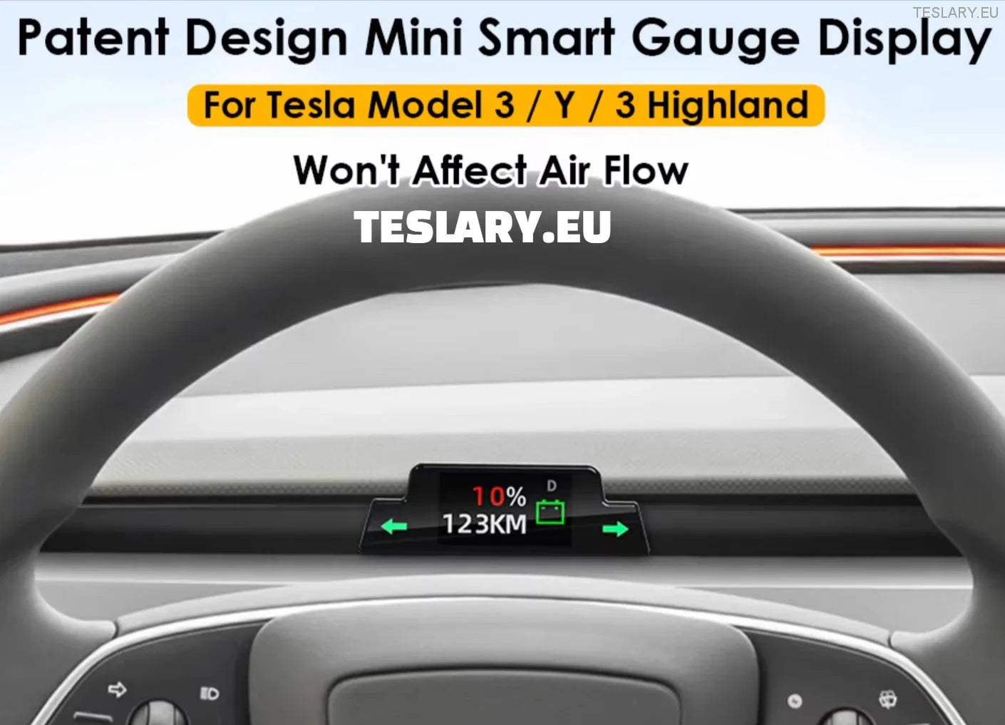 Vestavěný mini HUD s větracím otvorem: Speciálně navrženo pro vozy Tesla Model 3 a Y a Model 3 Highland. Vhodné pro vozy s levostranným i pravostranným řízením. Zobrazování informací o voze v reálném čase: rychlost, převodový stupeň, stav baterie, dojezd, směrová světla. Malé rozměry, lze perfektně instalovat do větracího otvoru a nezpůsobí žádné ucpání vzduchu. Chytré a skryté.