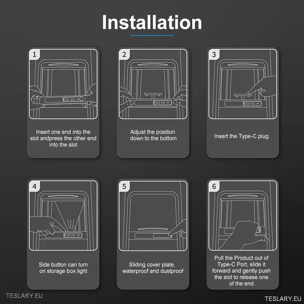 *1. Den spesialdesignede USB-dokkingstasjonen er perfekt kompatibel med midtkonsollen til Tesla Model 3/Model Y 2021–2022 (etter 6. november 2021), uten å påvirke interiørets utseende og normal bruk av oppbevaringsboksen.